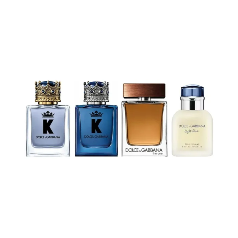 Giftset includes: 5ml K Eau de Parfum Spray, 5ml K Eau de Toilette Spray, 4.5ml Light Blue Eau de Toilette Spray, 5ml The One Eau de Toilette Spray.