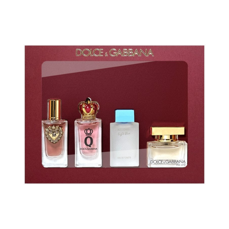 Giftset includes: 5ml Devotion Eau de Parfum Spray, 5ml Q Eau de Parfum Spray, 4.5ml Light Blue Eau de Parfum Spray, 5ml The One Eau de Parfum Spray.