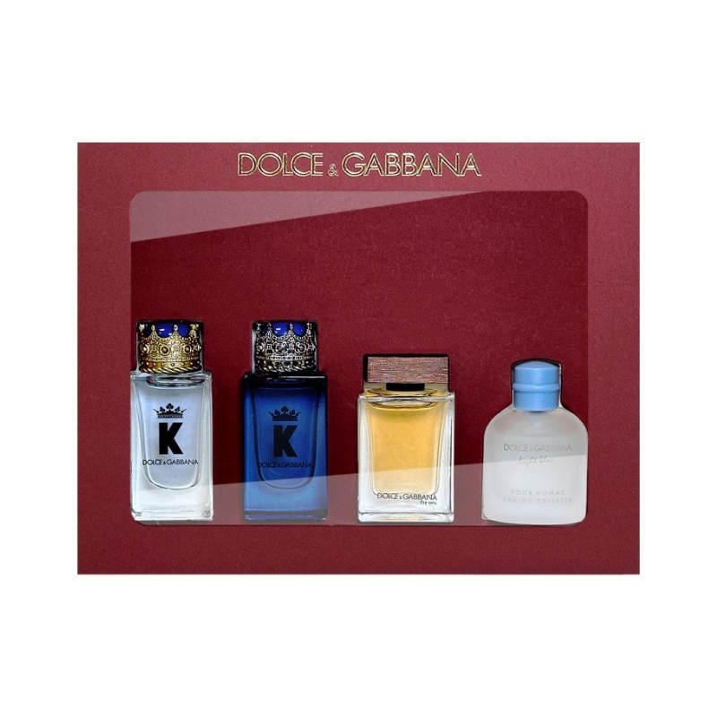 Giftset includes: 5ml K Eau de Parfum Spray, 5ml K Eau de Toilette Spray, 4.5ml Light Blue Eau de Toilette Spray, 5ml The One Eau de Toilette Spray.